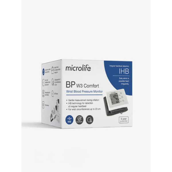 Το πιεσόμετρο καρπού Microlife BP W3 Comfort είναι ένα αυτόματο πιεσόμετρο καρπού με τεχνολογία Comfort+, για εξαιρετικά άνετη μέτρηση πίεσης κατά τη διάρκεια του φουσκώματος της περιχειρίδας. Το BP W3 Comfort αποθηκεύει έως και 30 μετρήσεις πίεσης με ημερομηνία και ώρα και εμφάνιση μέσου όρου. Επιπλέον, η συσκευή διαθέτει τεχνολογία IHB για την ανίχνευση ακανόνιστων καρδιακών παλμών εμφανίζοντας το σύμβολο IHB στην οθόνη. Το πιεσόμετρο διαθέτει πρακτική θήκη αποθήκευσης, ιδανική για μεταφορά κατά τη διάρκεια του ταξιδιού.